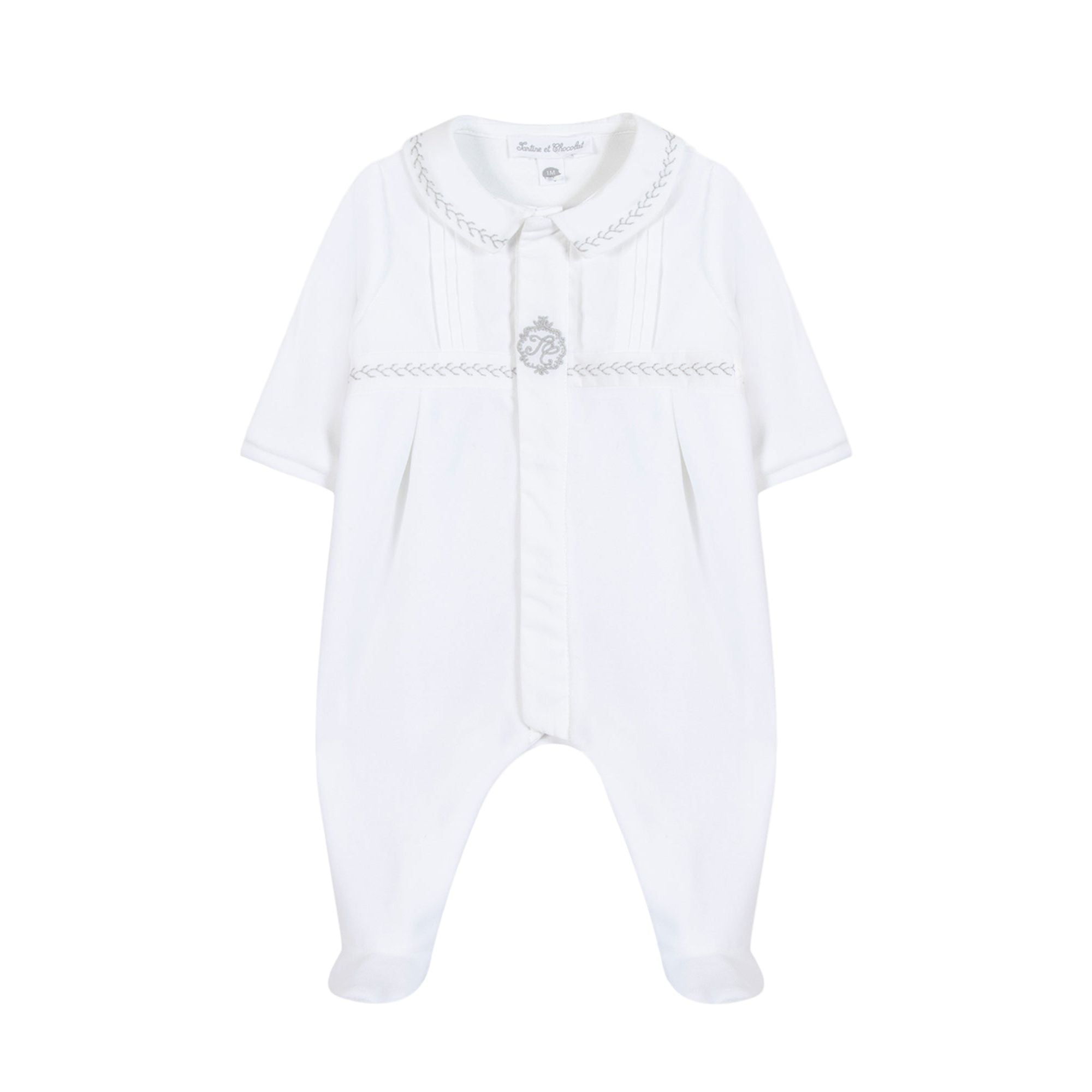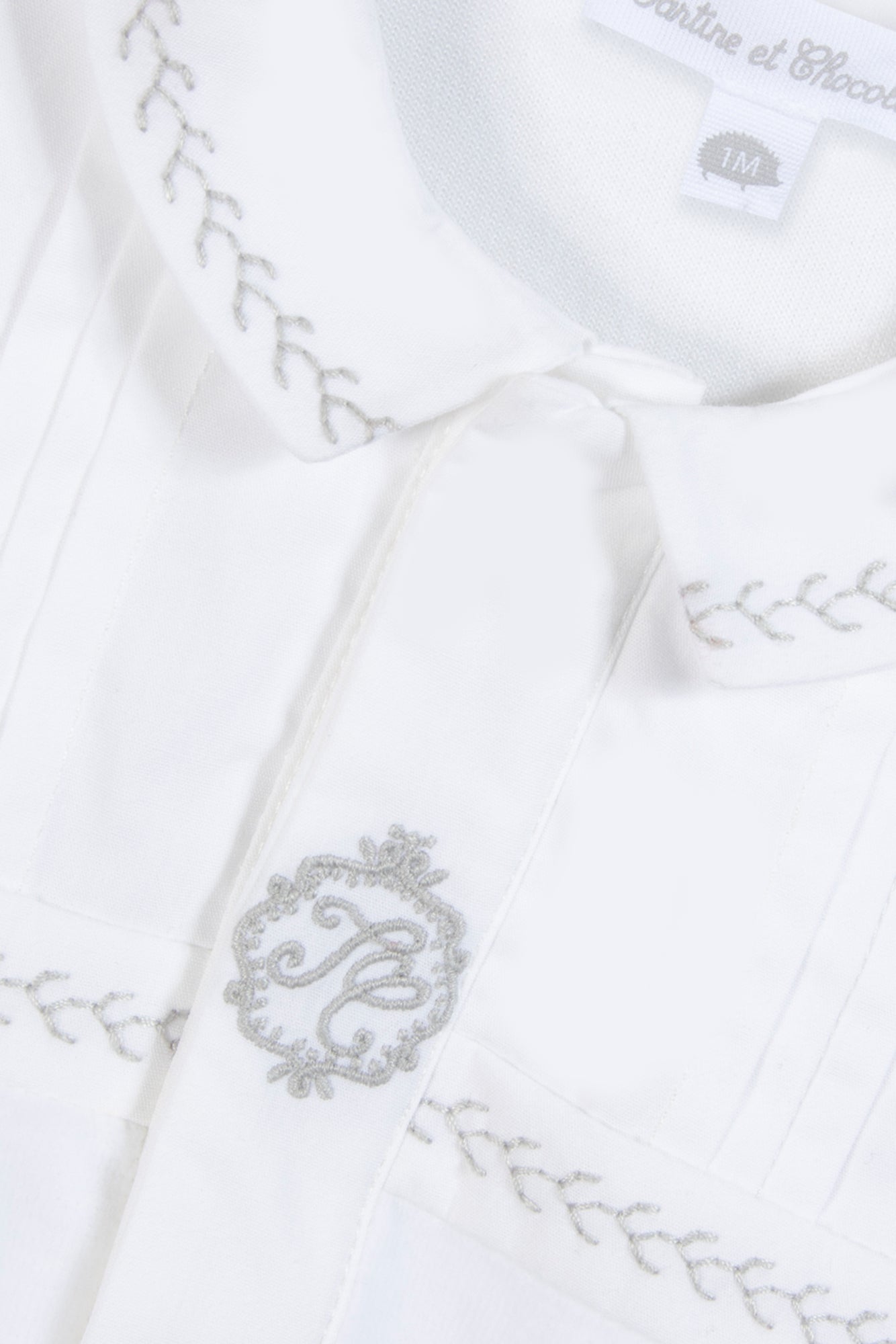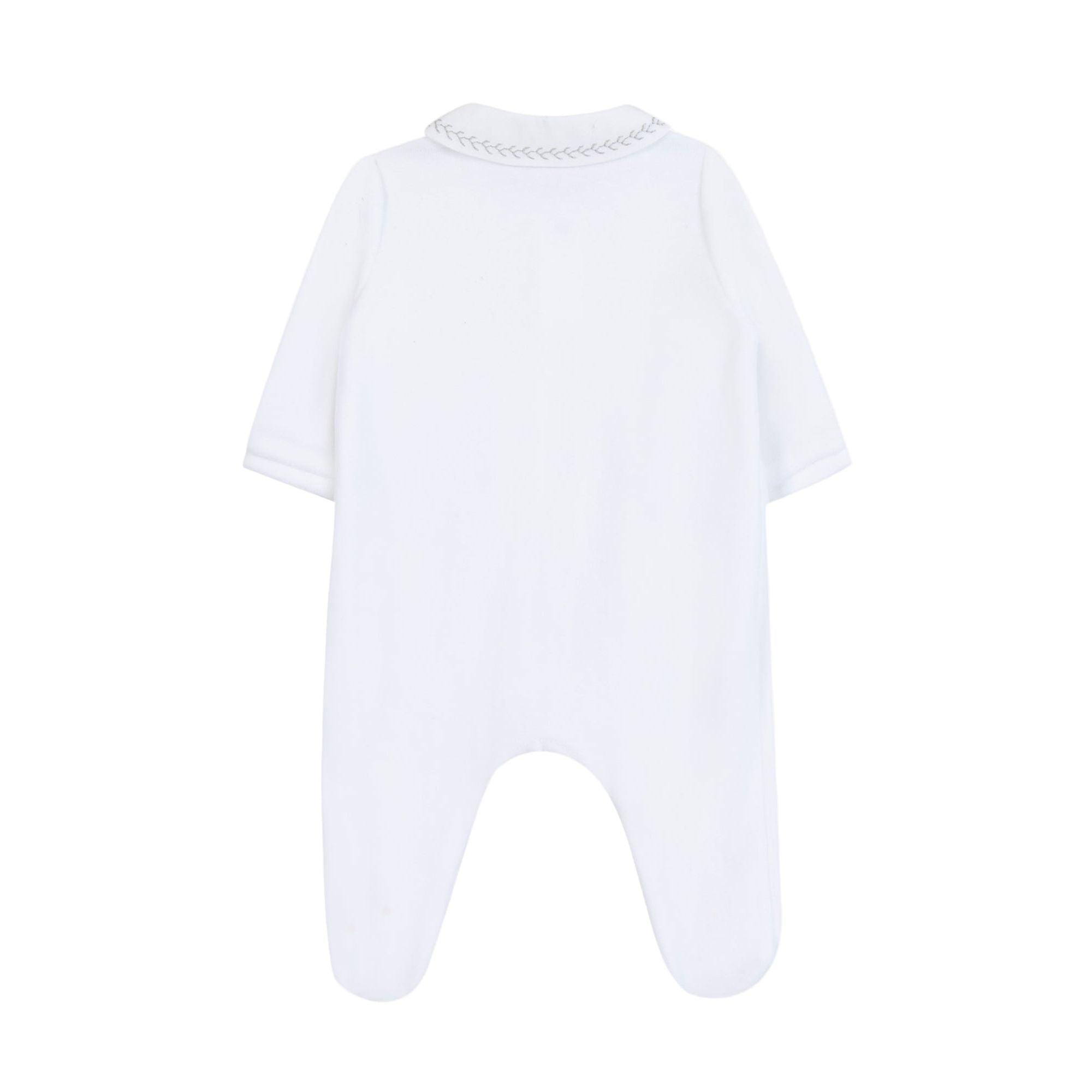 This Tartine et Chocolat white velvet onesie features softness in every detail. The religious pleats add a delicate touch, while the pointed collar is adorned with subtle gray embroidery for a soft, refined look. A comfortable and elegant essential, designed for the first days.