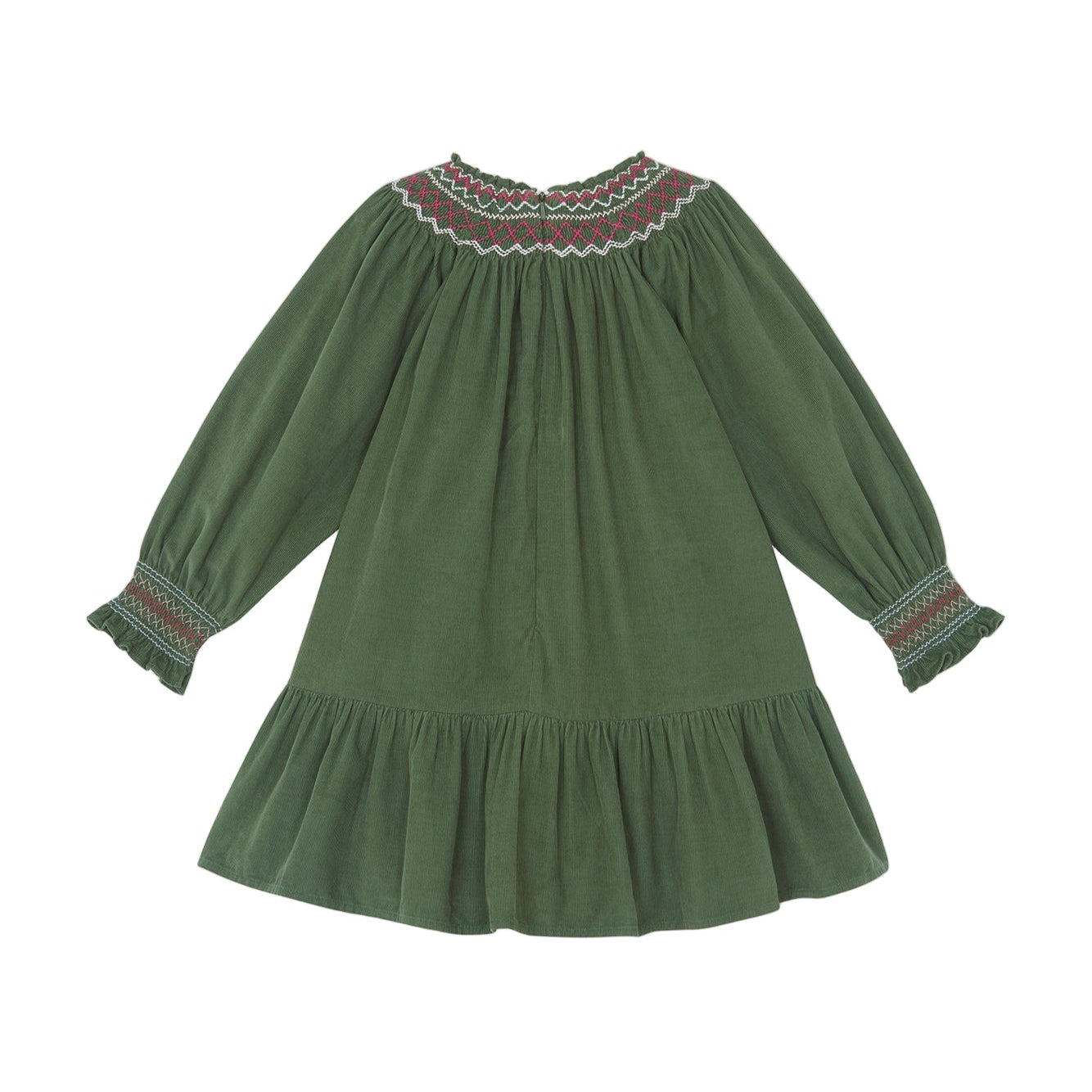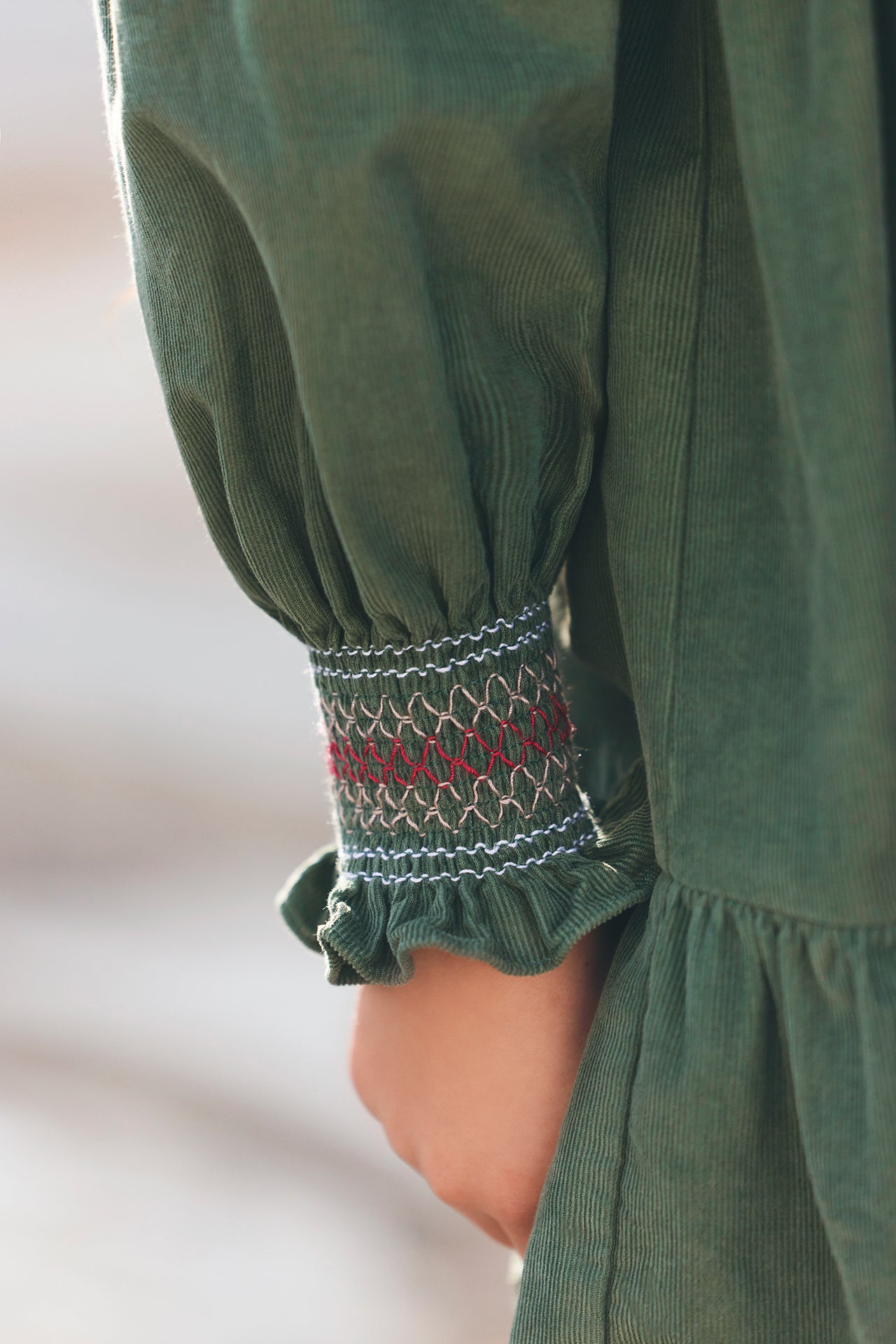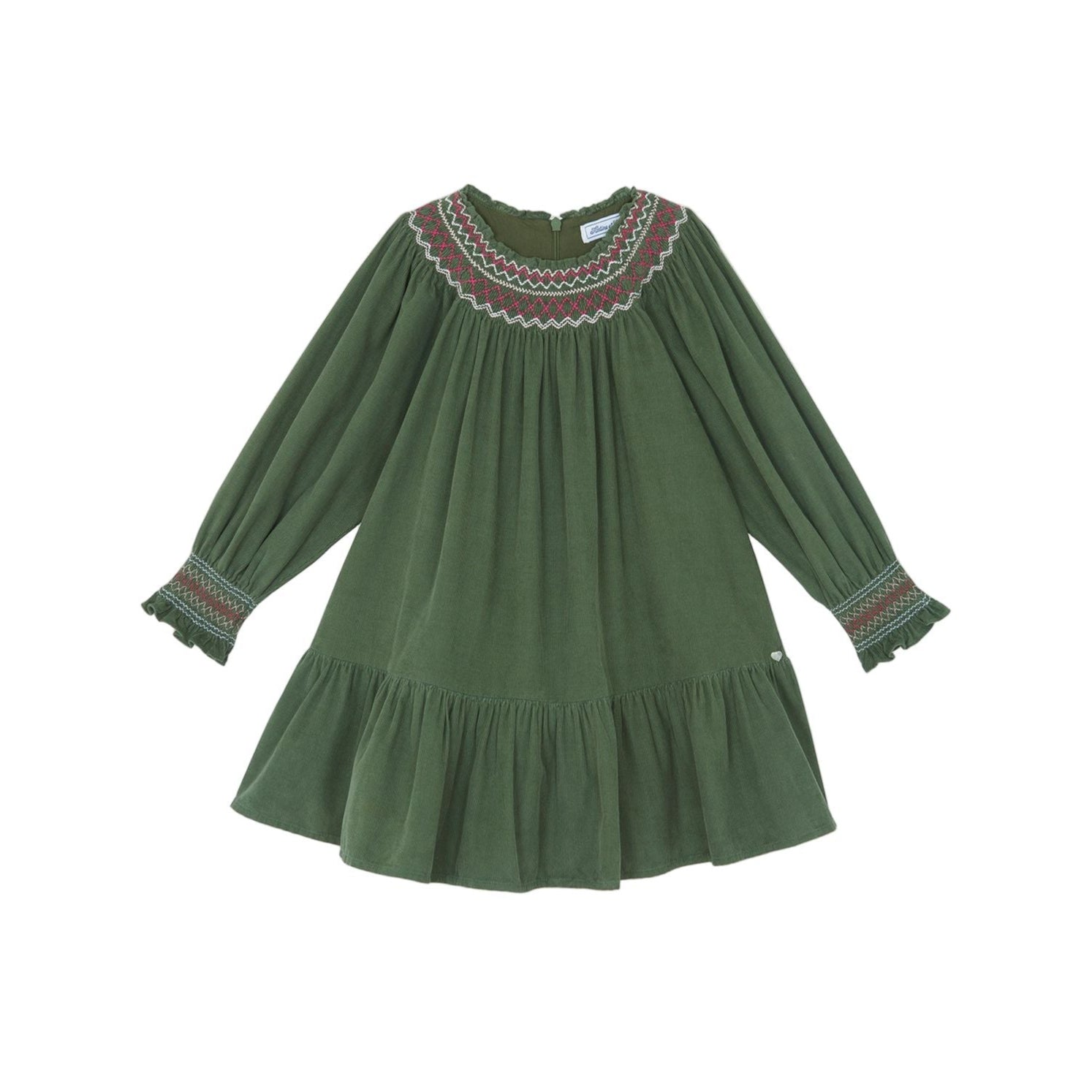 This Tartine et Chocolat dress, in green velvet, combines softness and elegance. The delicate hand embroidery on the collar and sleeves adds a touch of refinement to this warm piece. Perfect for creating a dressy and comfortable outfit during the winter season.