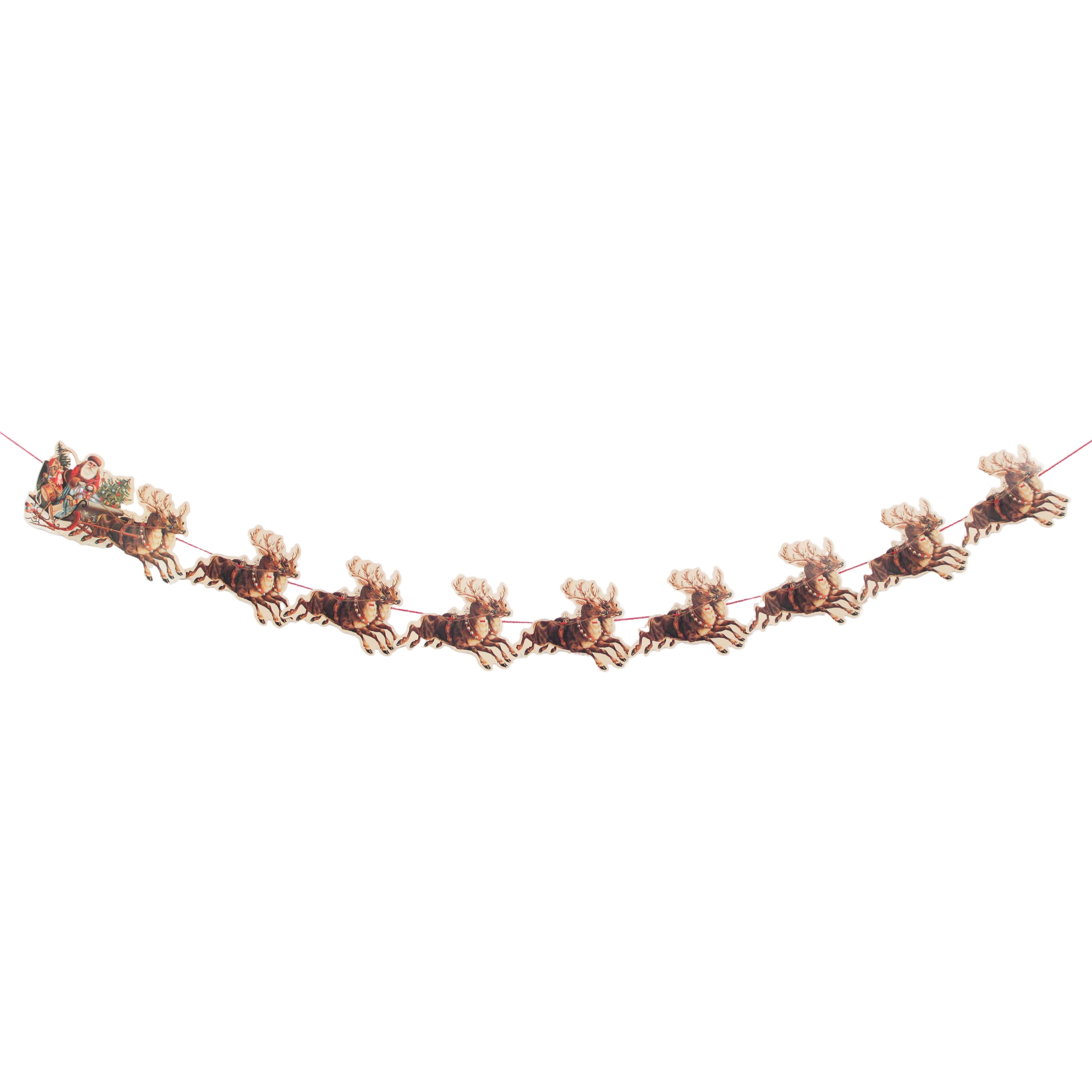 A beautiful paper garland featuring Santa Claus with his sleigh full of toys being pulled by 9 sets of reindeer, a perfect addition to your decorations for Christmas.